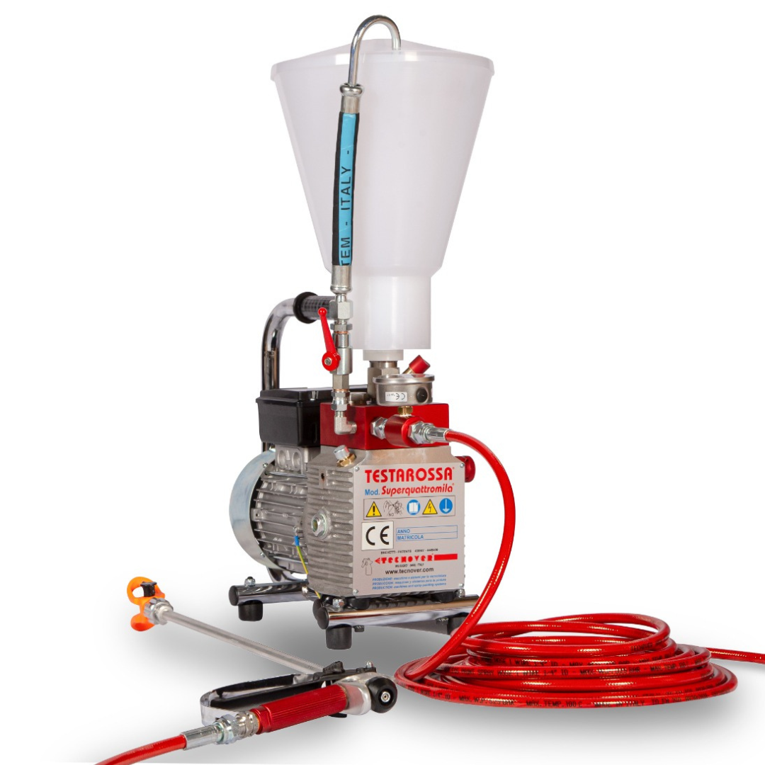 Airless paint sprayer strength Testarossa series mod. Superquatomila Portable is its extreme maneuverability: it has a low weight of 25 kg and with its practical handle and the 6-litre drop tank it lends itself to be used even in confined spaces.
